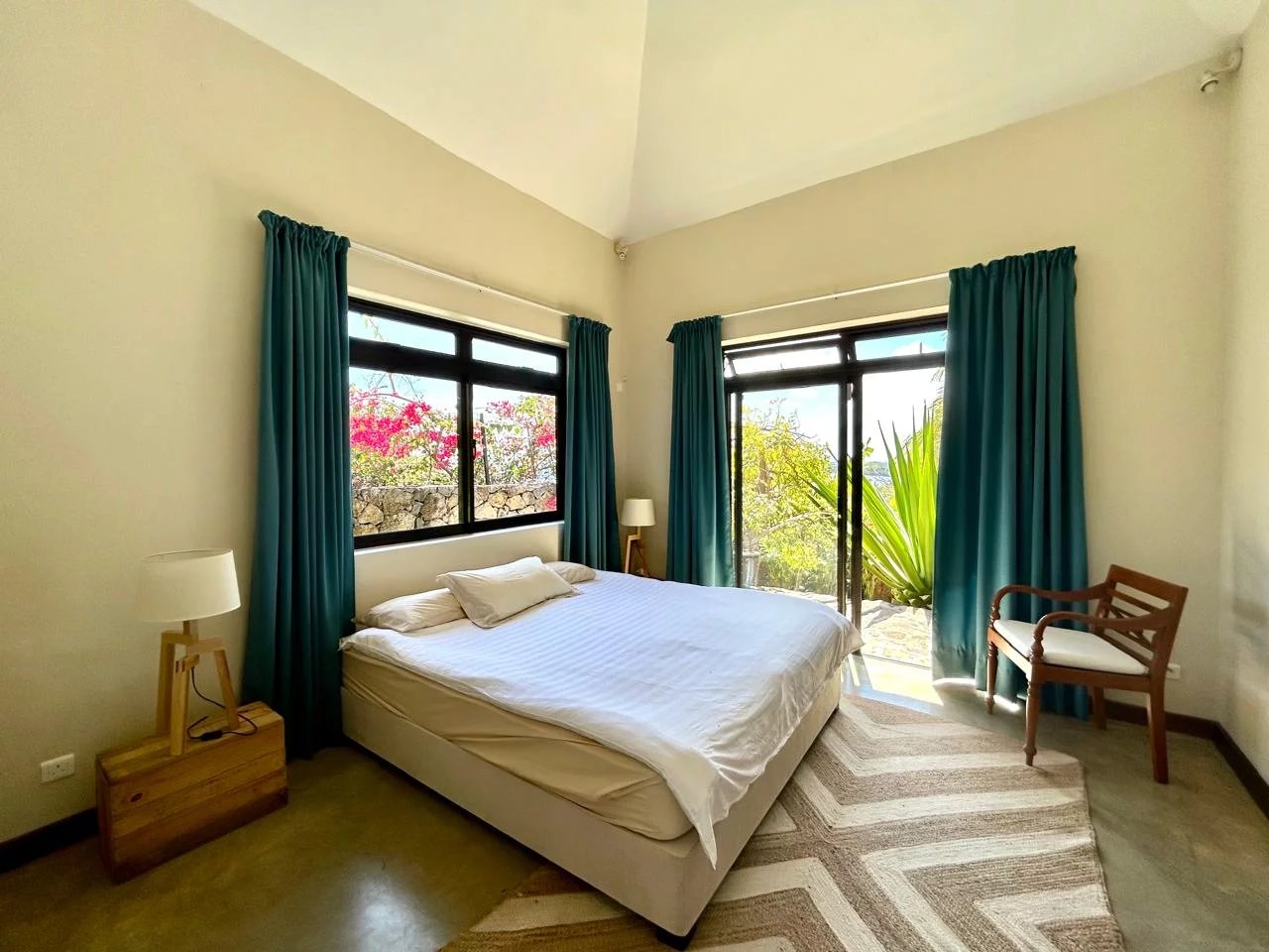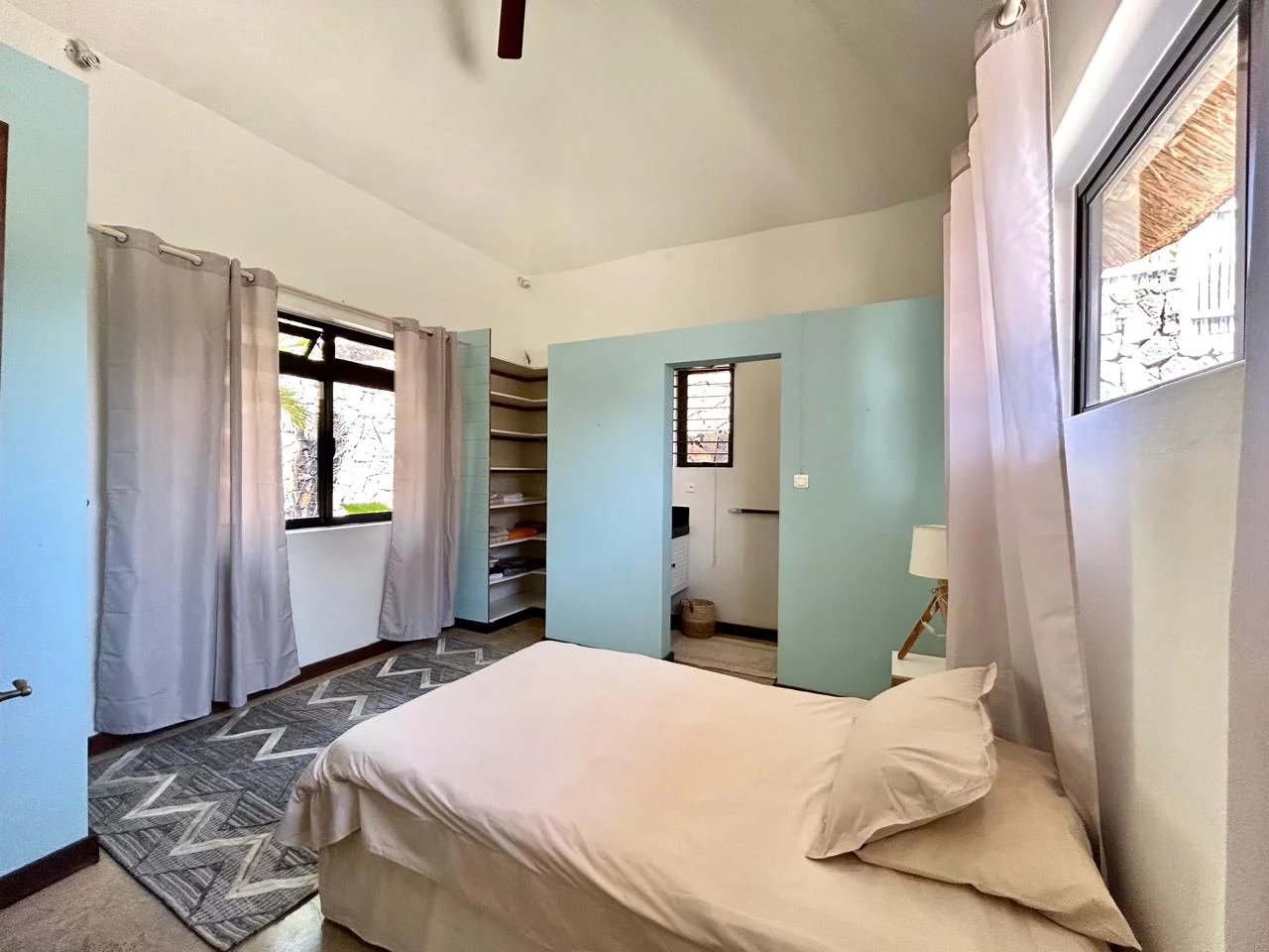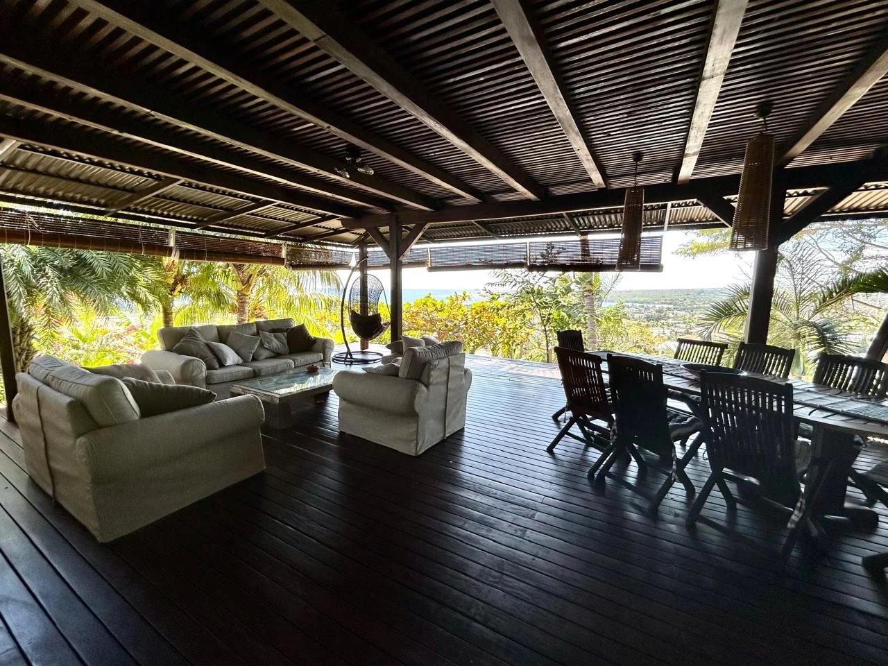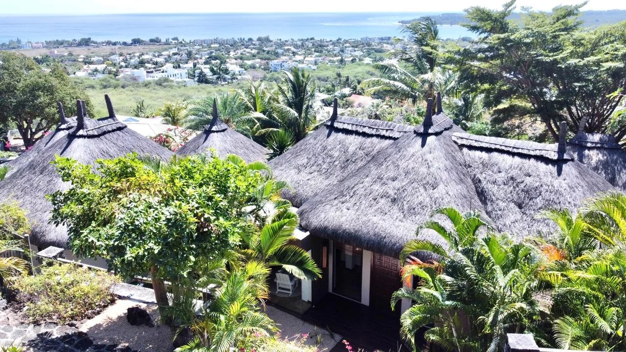 The thatched roof adds character and authenticity while enhancing the tropical charm of the home. From the main living areas, residents can enjoy stunning views over the western lagoon, Tamarin Bay, and the surrounding mountains.