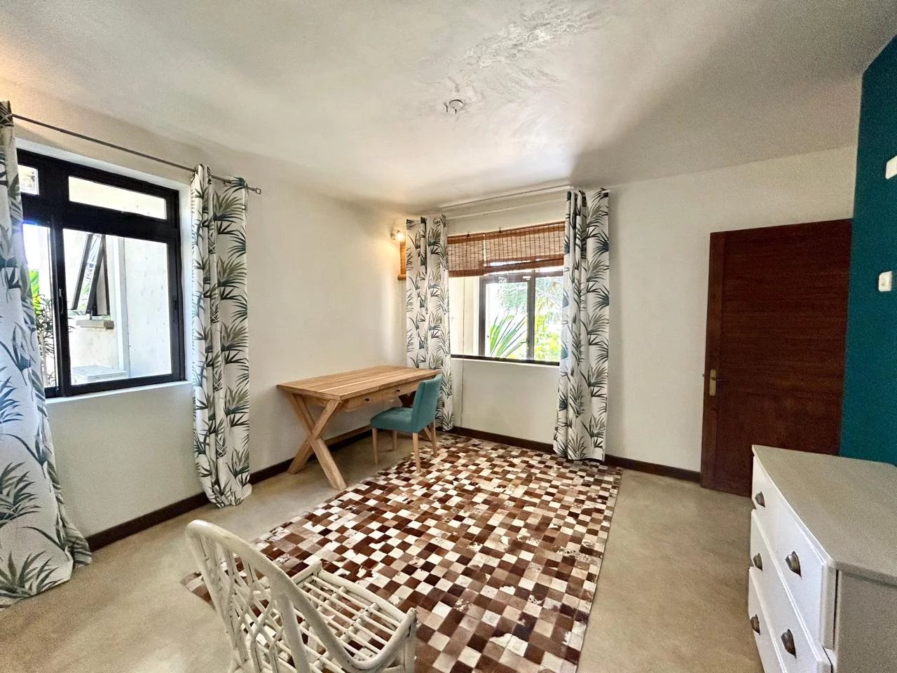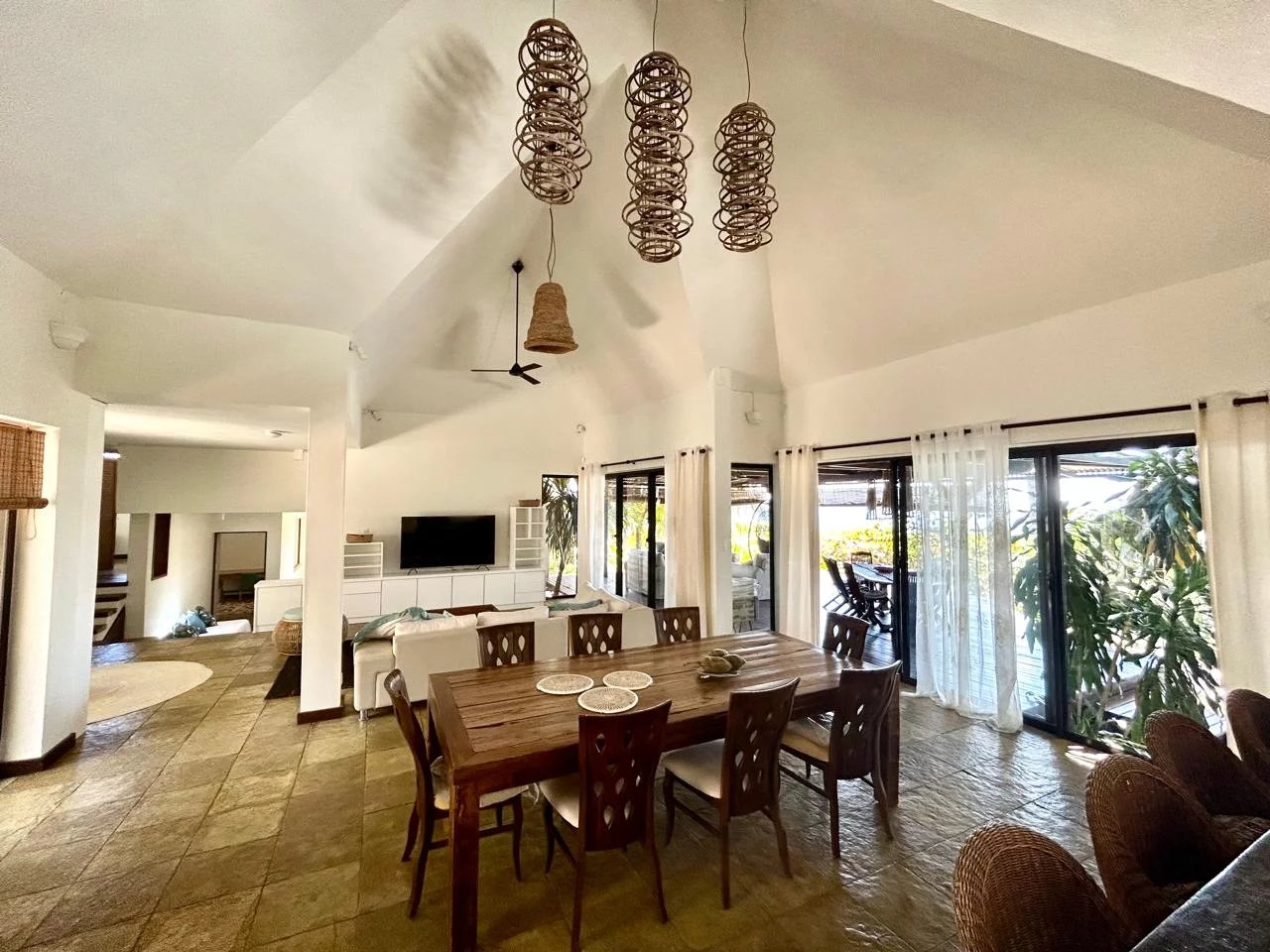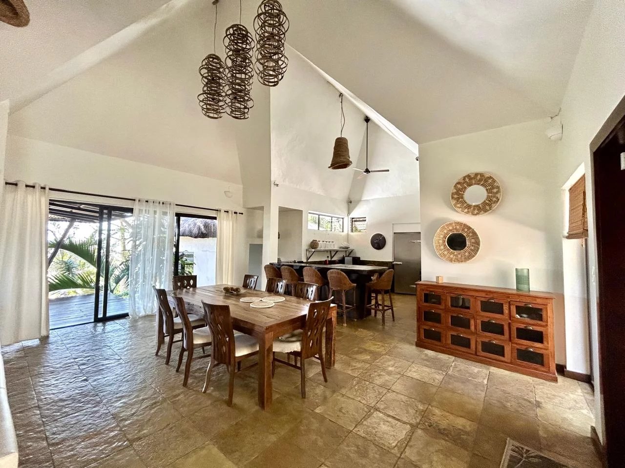 The thatched roof adds character and authenticity while enhancing the tropical charm of the home. From the main living areas, residents can enjoy stunning views over the western lagoon, Tamarin Bay, and the surrounding mountains.